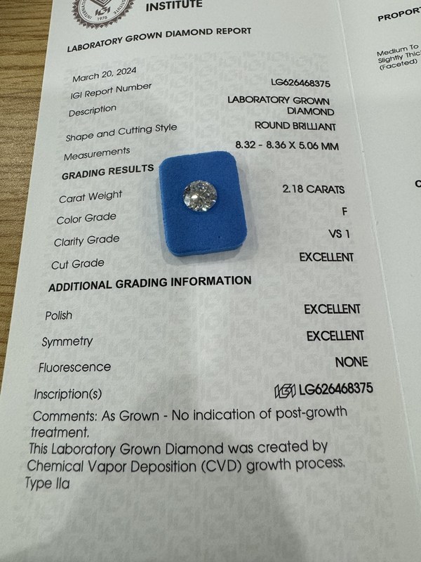 2.18CT F VS1 3EX सीवीडी लैब बढ़ी हीरा गोल कट आईजीआई प्रमाण पत्र।